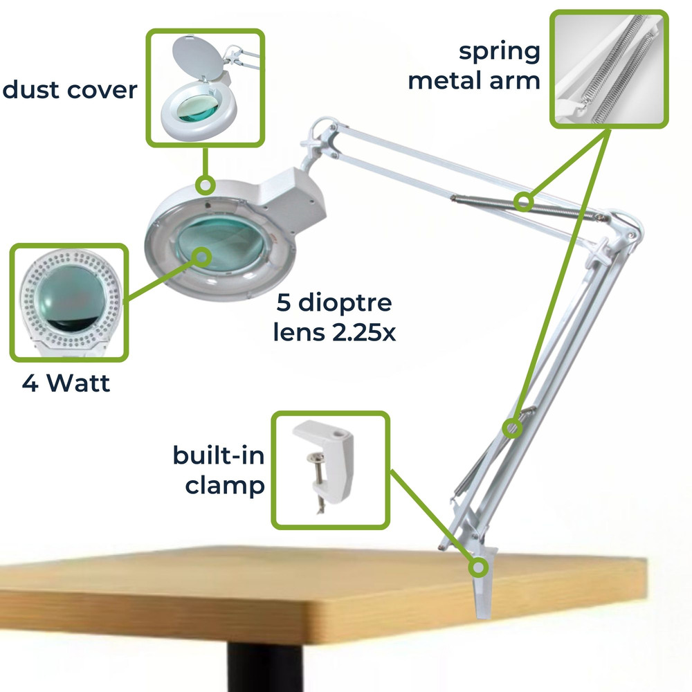 Voor precisietaken thuis biedt deze LED-bureaulamp met vergrootglas de ultieme combinatie van helderheid en nauwkeurigheid. Uitgerust met een 5-dioptrieënlens, vergroot het je zicht 2,25 keer, ideaal voor detailgericht werk. De stevig gebalanceerde arm zorgt voor een gemakkelijke plaatsing in elke gewenste positie.
